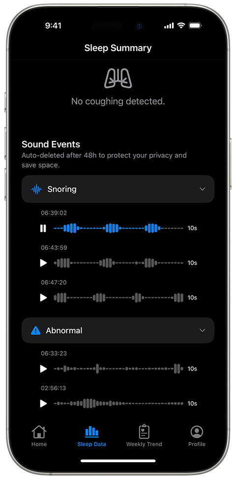 Don’t just take our word for it—tap Playback to hear the sounds you made at night. Snore highlights key audio clips for you to review and analyze.